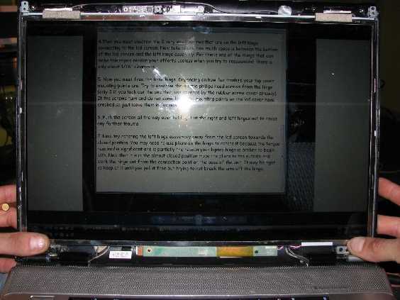 Presione la pantalla completamente abierto mantiene a las bisagras derecha e izquierdas no causa ningún trauma posterior. Si la bisagra es lejos y no se puede mover, tienes que forzar la bisagra con los alicates al quitar que durante el siguiente paso.