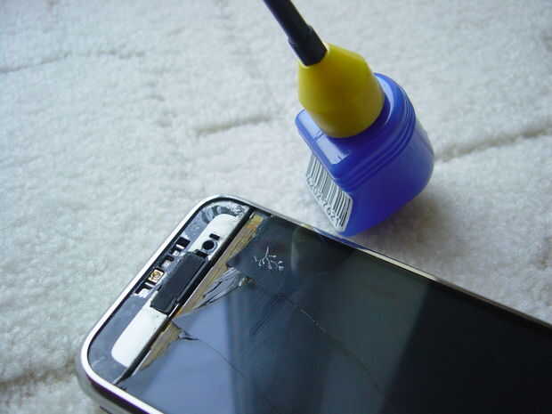 En primer lugar se me quitan las virutas de cristal quebrado de la zona dañada seriamente con una pinza. Debajo de las está el altavoz y los sensores de luz.