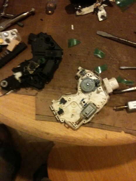 El conjunto está ahora junto por los clips y el plástico es muy frágil. Propongo agarrar una botella de plástico de refresco y un montón de cuñas pequeñas del corte. Tomo las calzas poco y deslice entre los clips que hace estallar la unidad abierta mucho más fácil. Una de las cosas que temía estaba allí es un montón de resortes dentro de la unidad que haga estallar hacia fuera y ser imposible volver a poner en su lugar. Por fortuna - no es el caso. -Así que no temas y abrir la carcasa.