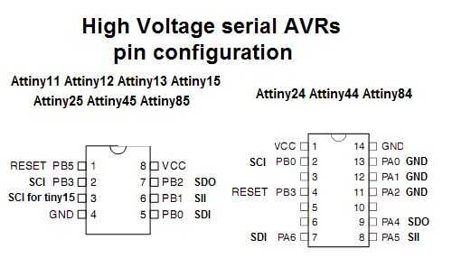 Programación Serial de alto voltaje (HVSP) para reparar fusebits. Ante todo paciente esté en programación de alto voltaje de la memoria, luego leemos firma y comprobar si es compatible. Luego se realiza el borrado del chip si el usuario lo permite. A continuación las lockbits se leen, si no establece, el paciente recibe fusebits nuevo, apropiado para el modelo leído. Después de eso, fusebits son verificados, y si pasan la prueba – este es final del trabajo. Si no, el médico repetirá escritura-verificar ciclo 10 veces y abandonar cuando sin éxito.