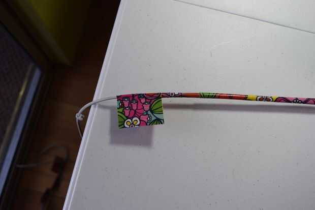 Corte dos 4 pulgadas los trozos de cinta adhesiva. Los ponen perpendicular a la cuerda donde el borde de la cinta "paralelo" con el cable. Ahora doblar la cinta sobre el cable y alinee con sí mismo para hacer una "bandera" (ver imagen). Recortar el borde de la bandera hacer uniforme.