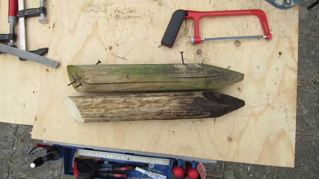 Tuve suerte porque una de las patas era todavía buena. así que sólo tuve que cortar dos nuevos. primero medí la longitud y el ángulo de corte. tengo un pedazo largo de madera del mismo diámetro que el original. mis piernas son alrededor de 40 cm o 15,7 pulgadas. no importa si usted consigue el ángulo equivocado porque cuando montaje te puede colocarlos en un lugar diferente.