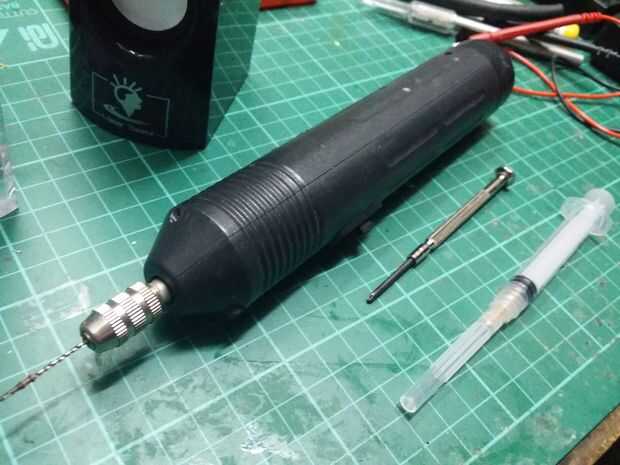 Aquí son las herramientas que utilicé: -Un eléctrico del taladro con una broca de 1,2 mm -A la jeringuilla con una aguja -Un destornillador philipps -Epoxi / un sellador impermeable