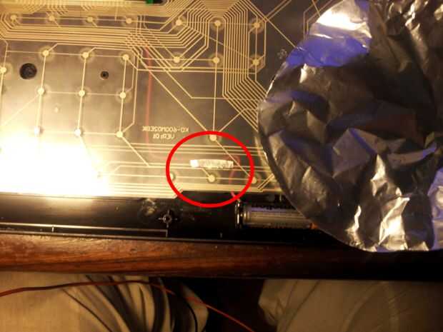 Vea el círculo rojo. He puesto la tira de aluminio entre láminas de plástico inferior y medio. Si ha aislado la falla correctamente y coloca el papel de aluminio sin un corto. Las llaves deben trabajar ahora.