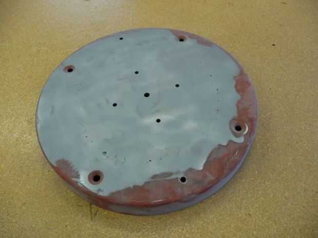 Después de la soldadura con chorro de arena la pieza.  Puesto que anteriormente era cubierto polvo, acabado rojo era obstinado.  Decidí dejarla áspera y probar una técnica de recubrimiento en polvo no estándar.