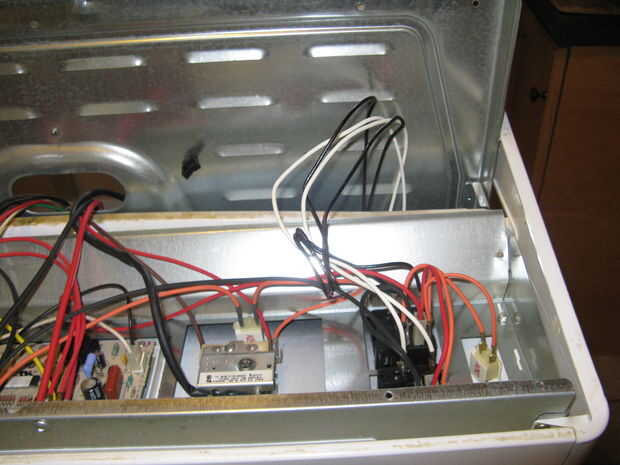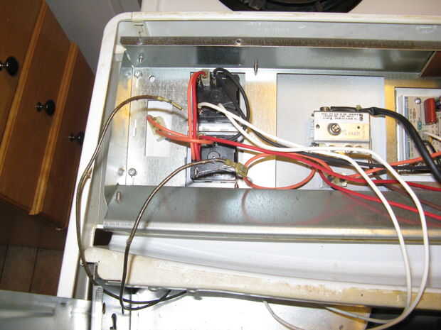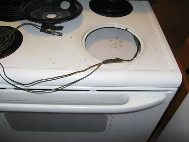 En la parte delantera de la estufa tie que la nueva toma de corriente lleva a los extremos del viejo conduce con cinta adhesiva y utilizando la vieja lleva como una serpiente, tire los cables nuevos a través de la parte superior del hornillo para el control del elemento.
