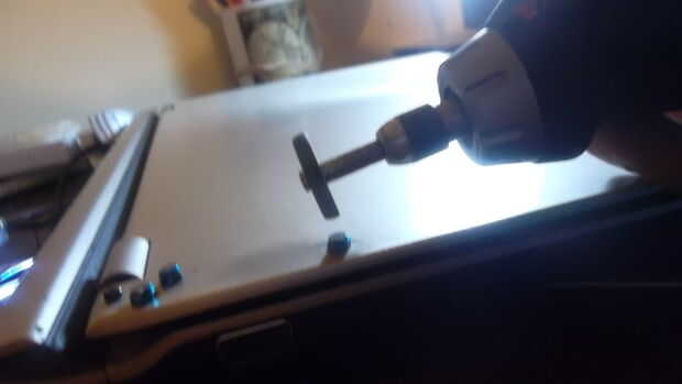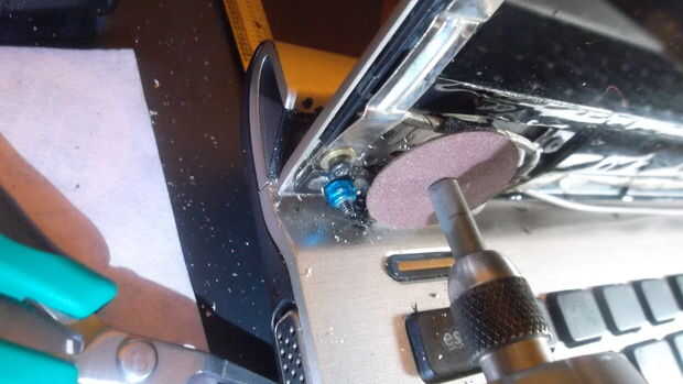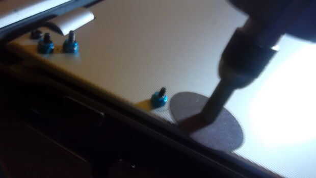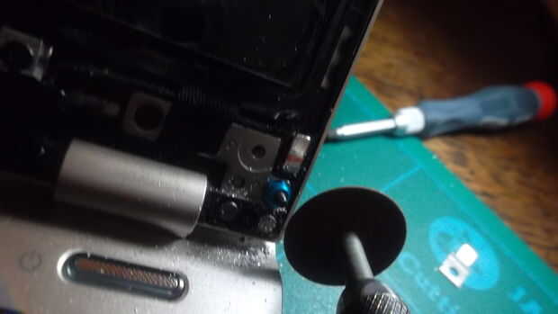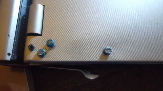 cuando los tornillos que sujetan la bisagra a la pantalla de mi laptop dio para arriba el fantasma, que necesitaba una solución rápida. Una pequeña tachuela actuando como un remache hace el truco.Paso 1: Quitar bisel No entraré en demasiados detalles