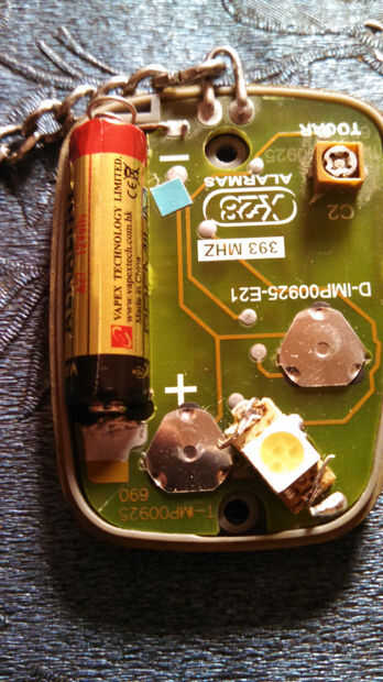 Coloquè la pequeña batería, y testié la polaridad de la placa del control remoto, para hacerla coincidir con la de los leds.