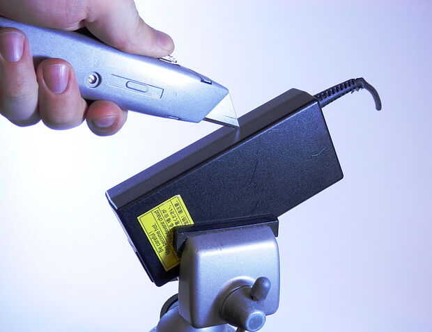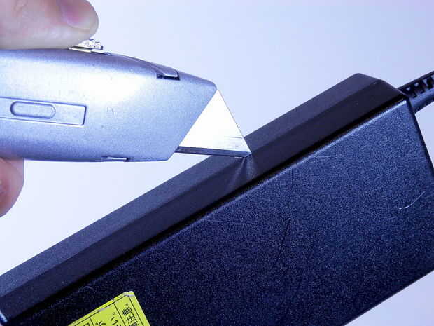 Para abrir un ladrillo pegado o soldado con autógena energía, empiece por fijación en un torno o con una abrazadera. Ahora, usando una marca de cuchillo agudo de la utilidad repite cortes a lo largo de la costura hasta que han cortado a través de la carcasa plástica exterior. Es importante dejar de cortar tan pronto como usted está con el plástico para no dañar los componentes electrónicos. Tómate tu tiempo. Paciencia reditúa grandes en este paso. Normalmente paso por lo menos 15 minutos corte cuidadosamente a través de toda la juntura. Me enfoco en un lado del ladrillo a la vez. Además, nunca he tenido de cortar alrededor de la baja tensión del cable o el conector del cable de alta tensión. Solo se pegan a la costura larga, horizontal de corte en los 4 lados.
