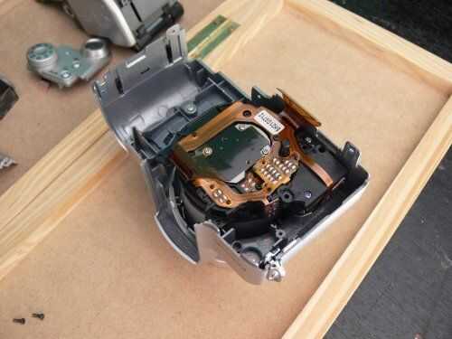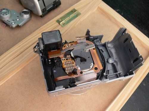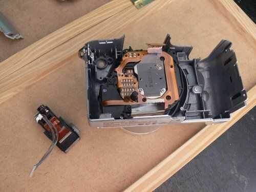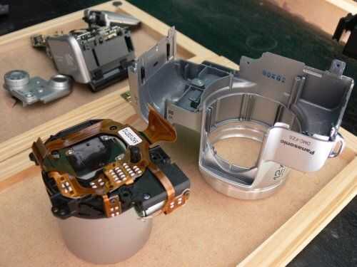 Dos de las piezas que se muestra a continuación se fijan en el interior de la cámara de una manera bastante desvencijada. Muy sólidamente se sujeta la lente en lugar de curso, pero no son la Asamblea de AF/EVF y el motor de la lente. También están hechas de plástico blando. La lente está pegada a causa de estos defectos.