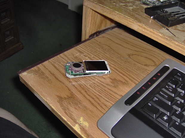 tenemos que llegar a la toma de audio, eliminar por completo la cubierta posterior y la batería. y el segundo conjunto de cuatro tornillos. Pop luego de la portada, luego retire la placa principal y darle la vuelta.