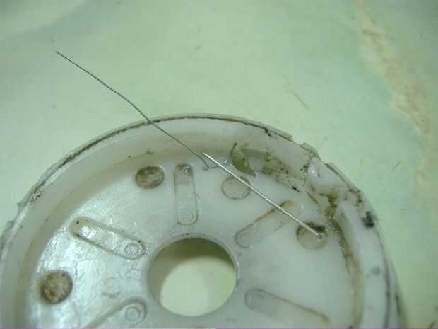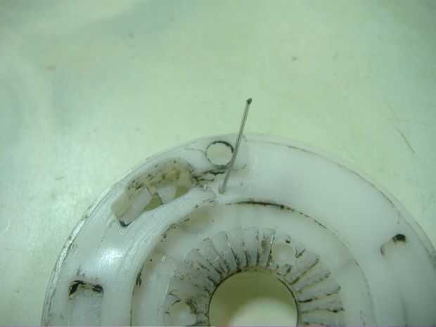 Un agujero, elegí como 3-4mm de la donde la cabeza de barril (extremo del cable) es empujado hacia adentro, en la dirección se irá el cable hacia la bobina. Mi agujero es de 1.5mm, pero podría ser más pequeño.