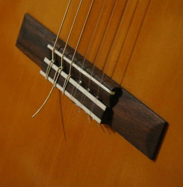 En el caso de mi guitarra, encontré que el dueño anterior había colgadas lo con el tipo equivocado de cadenas. Como se puede ver en las imágenes de abajo, la guitarra fue significada para cuerdas de nylon. Existen diferencias estructurales entre los dos tipos de guitarras. Las diferencias son tan grandes que usted puede sentirse simplemente levantando la guitarra---la guitarra de cuerdas de acero pesa 2 - 3 veces más que una guitarra clásica. Toda esa masa es debido a las medidas de refuerzo y otros para fortalecer una guitarra de cuerdas de acero para que resista el tirón de las cuerdas tensas. Cuando mi clásica fue colgada con cuerdas de acero, el cuello rompió limpiamente. Claramente, la fijación de la guitarra no resolverán el problema a menos que usar cuerdas de nylon en el futuro.
