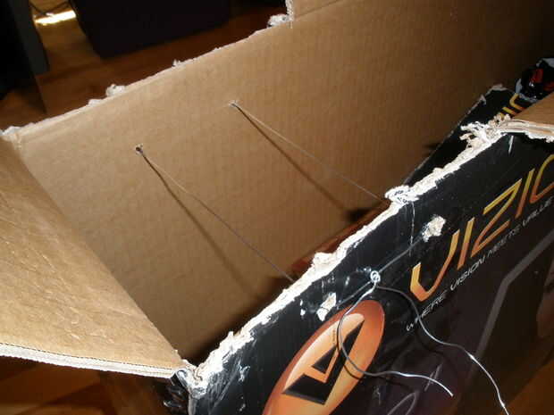 Asomó 4 agujeros en una caja de cartón que mi TV vino en, rosca el cable de aluminio a través y atados a un lado. No amarrar demasiado fuerte o cortará a través de la cartulina, lo suficiente como para que sea un poco apretado.