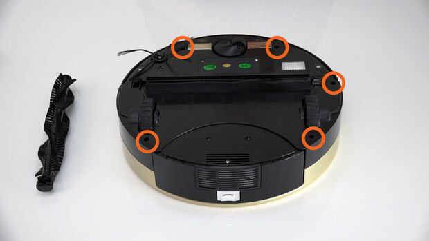 Hay cinco tornillos alrededor de los bordes de bObsweep. Dos se instalan en la parte superior y parte inferior y uno en el extremo derecho del cepillo principal.