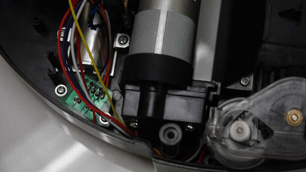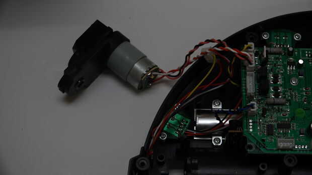 Levante el motor recto, luego desconecte el conector de la placa principal. Tiene dos pares de cables trenzados: una rosa y blanco, el rojo y negro.