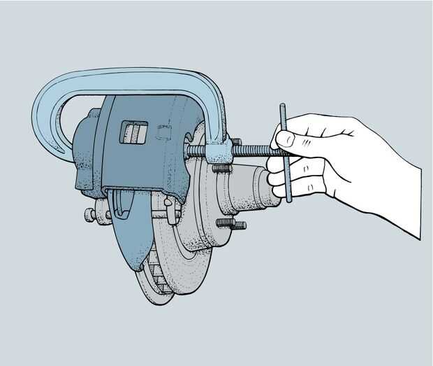 Compruebe el nivel de líquido de freno en el depósito y si es coronado nivel máximo, extraer una pequeña cantidad (de lo contrario puede desbordarse durante la prueba). Configurar la pinza por lo que está en el borde superior de la C contra el punto medio del lado interior de la pinza (detrás del pistón) con la punta del tornillo impulsor justo enfrente. Dependiendo de la forma de la pinza, el tornillo impulsor también podría tener contra el lateral de la zapata de freno de motor fuera de borda o incluso contra la superficie del rotor.