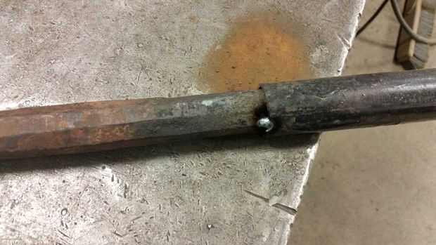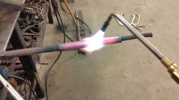 Este paso debe haber sido fácil. Deslice el tubo, soldar con autógena hasta satisfecho. Pero tenía que conseguir estas ideas fantasiosos en mi cabeza. El tubo se desliza sobre la barra de palanca. Una soldadura de tachuela rápido para mantener en su lugar, tendría que hacerse más grande más adelante. Y luego en el proceso de reducción de la tubería a la forma cónica de la barra.
