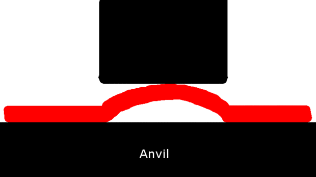 Así que si golpeo mi pipa con aire entre ella y el bar, se encogerá siempre tan levemente. Pero si pellizque entre el martillo, bar, sándwich de yunque, se estirará. La mejor manera para contar lo que está sucediendo es de oído. Sordo ruido sordo-como sonidos generalmente van a encoger de metal. Alto timbre sonidos son casi siempre metal está estirando.