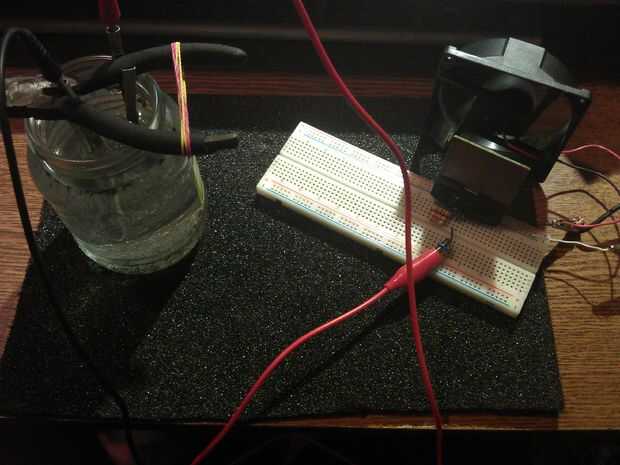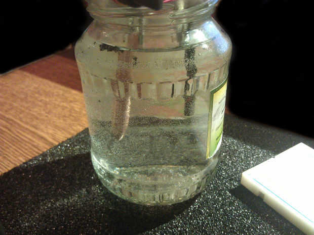 Coloque la varilla de grafito y la punta en el recipiente y la fuente de alimentación. Como ya he dicho 500 mA sería genial, pero realmente no importa, la corriente sólo afecta a la vez que proceso lleva...