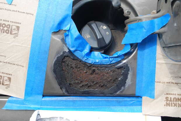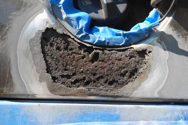 Encontré, debajo de la capa exterior de metal, lo que yo pensaba eran capas adicionales de metal oxidado, de saltar, era relleno de espuma densa realidad. Rasparon el resto de las virutas de metal de la espuma. Luego grabó fuera del área y había rociado con un tratamiento antioxidante.