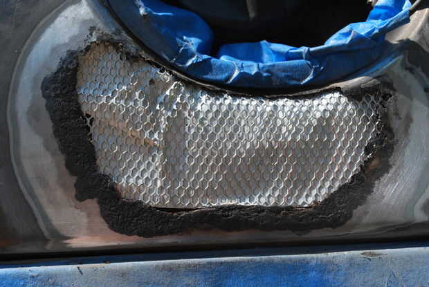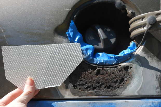 Usando las tijeras regulares, cortar la malla aproximadamente la forma correcta y entonces comenzó el ajuste en el orificio entre el metal y la espuma. A lo largo de la parte inferior, tuve que aflojar la espuma del metal un poco con un destornillador. Puesto que la zona es curva, tuve que forma el parche he trabajado, y conseguir el último rincón (superior izquierdo) algunos trabajos.