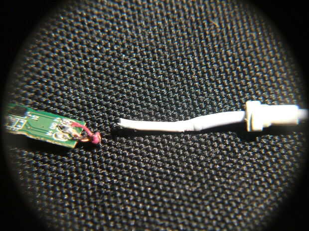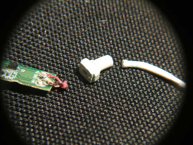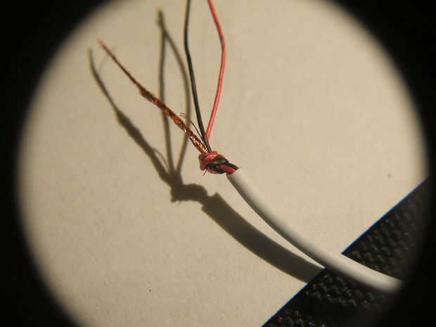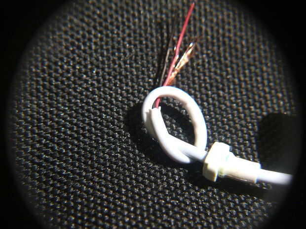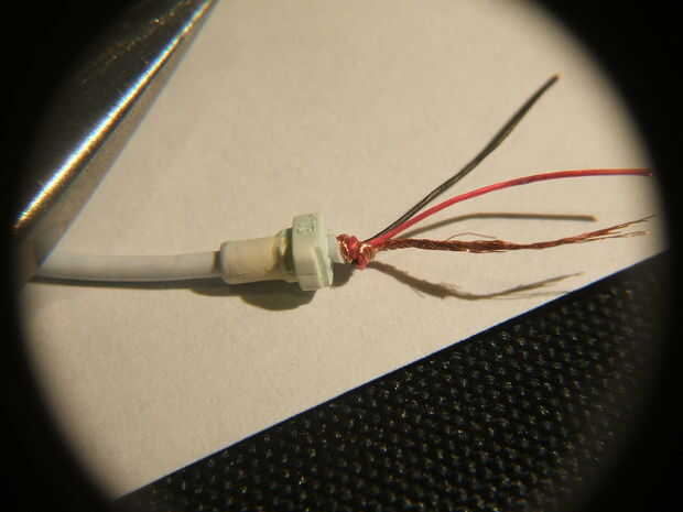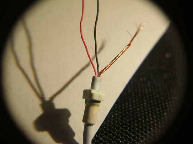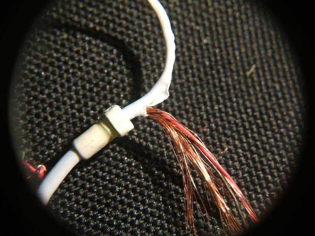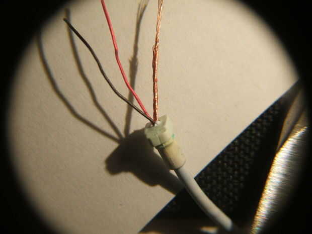 Luego tocó el violín y tirado para el Monte de alivio de tensión por el cable un poco - necesita estar en el cable cuando se hace el trabajo! Realmente lo tiró primero para liberarla de la funda del cable. Después alimentadas a través de y tiró de él hacia abajo. FACILITÓ el casquillo protector a lo largo del cable - no quiero romper los finos alambres internos durante este proceso!