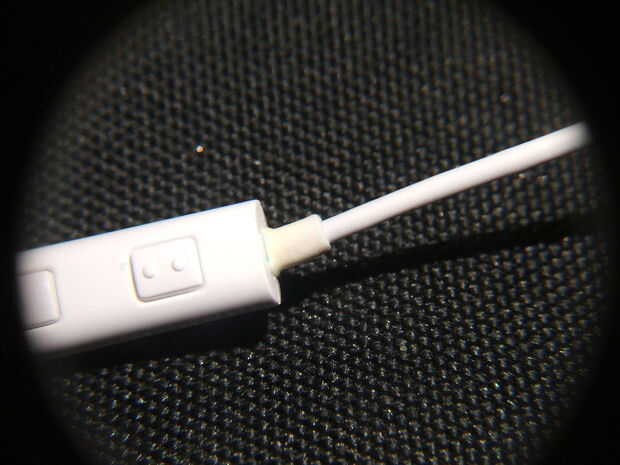 Cuidadosamente estañó el preparado cables - tenía un impacto grande como los núcleos de plástico de los dos cables se desvaneció. Creo que tenía la temperatura de la plancha un poco alta (400 grados C). Me gustaría sugerir el uso de flujo y aplicando el soldador para más breve tiempo posible - sólo lo suficiente como para estañar los cables.
