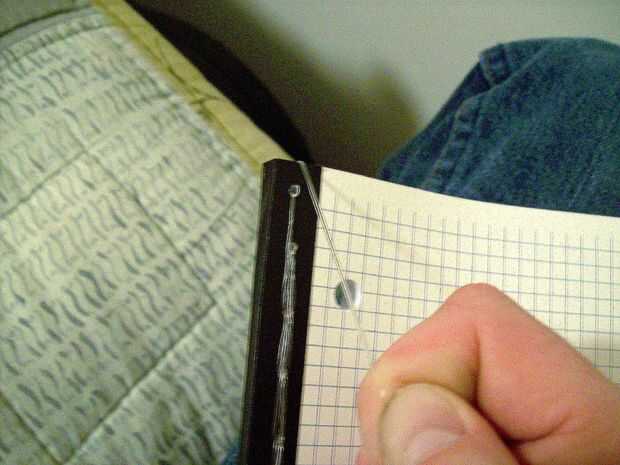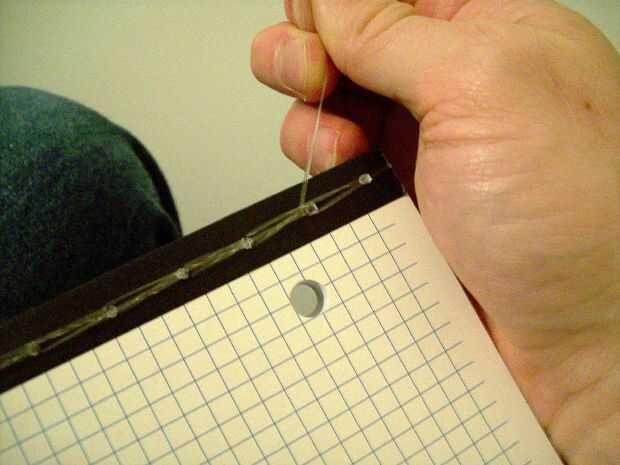 Una vez que te quedas sin los agujeros, se tire de la línea del segundo al último agujero en el frente y tire alrededor del borde inferior del Bloc de notas en la parte posterior. Entonces, el lazo alrededor de la línea donde rosca en el segundo al último agujero en la parte delantera. Tirar de él firmemente.