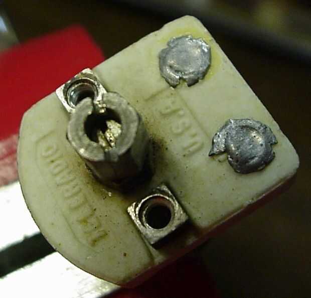 Ver la ranura de destornillador pequeño dentro? Normalmente esto sería mucho más cerca de la parte superior de la tuerca. No ser confundido por la ranura interna y ranura de la tuerca. Giran siempre juntos en una situación normal y este arreglo de doble ranura es para la conveniencia de la tecnología de alineación que estaría trabajando en el set de radio. La ranura pequeña está en el extremo del eje real, de que el otro extremo se sujeta en el tornillo de banco.