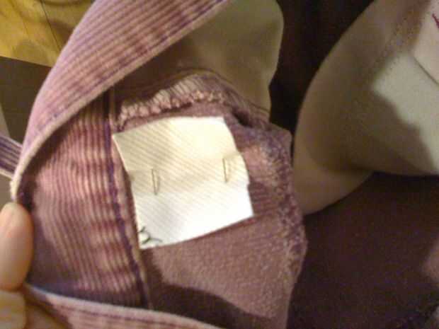 Perno en la parte trasera del pantalón, sobre el área donde está el agujero.