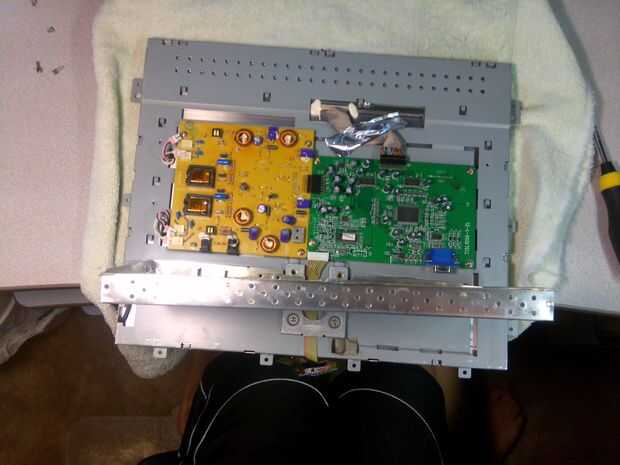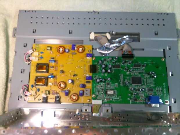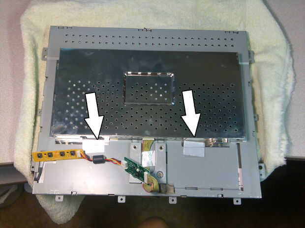 Después de quitar todos los alrededores de plástico, se quedarán con los huesos desnudos de su monitor LCD. Sin embargo, todavía habrá algunas cubiertas protectoras. Estos se utilizan para proteger los circuitos importantes. Uno de los cuales que tiene un problema. Para quitar estos revestimientos, simplemente retire cualquier cinta evidente del pisón o el tornillo que está sujeta en su lugar. En este caso, lo único que sostenía el escudo en su lugar estaba la cinta. Después de quitar la cinta, deslice el protector para exponer las placas de circuitos.