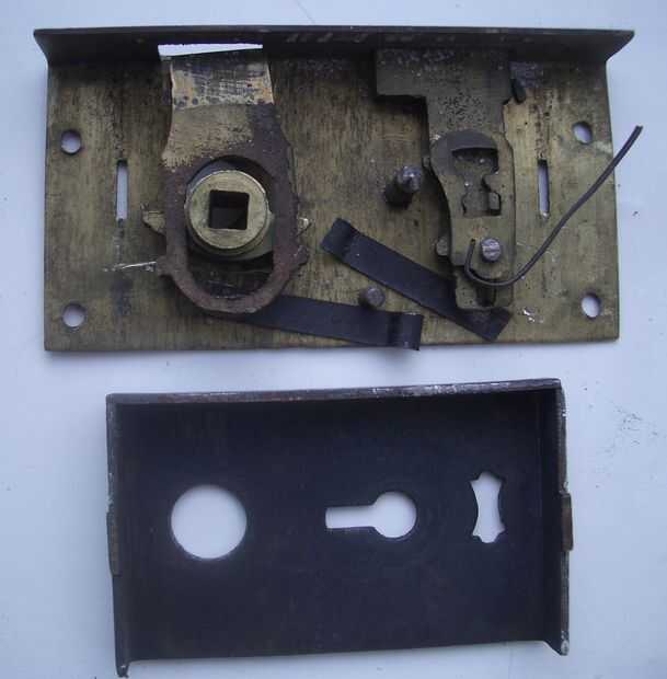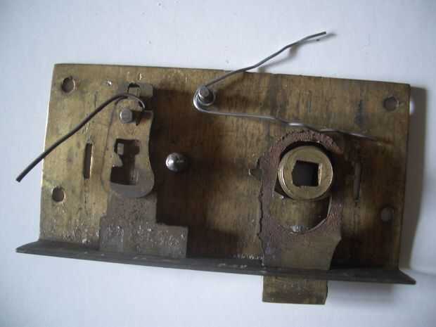 Se puede ver cómo el mecanismo de cierre se supone que el trabajo de jugar con él. Cuando el usuario tira de la palanca hacia abajo (o gira la perilla) en la parte exterior de la puerta, el eje gira y tira del pestillo hacia el caso, contra el resorte (que falta). Cuando el usuario le permite ir, el resorte empuja el seguro nuevamente hacia fuera a la posición cerrada. Sostenga la caja con el cierre hacia abajo como antes y comprobar que esto funciona. Si no entonces algo no está en muy buena posición, o hay un poco de resorte roto jamming cosas, violín que acerca hasta que está funcionando correctamente.