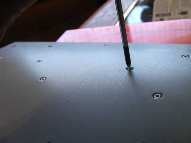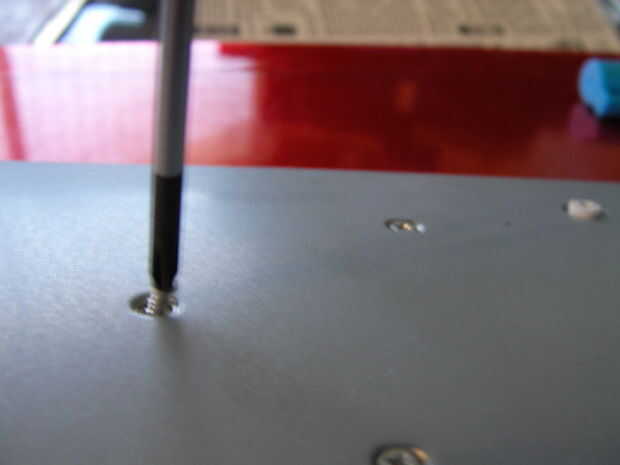 Esta placa fue unida con tornillos "penetrante". Por esta razón, debemos Alinee las roscas antes de alimentar los tornillos. Lo hacemos girando el tornillo en sentido antihorario hasta que sienta el clic de los hilos de la alineación. Luego cuidadosamente gire al atornillar el tornillo. Si el tornillo empieza hasta la punta, tire hacia atrás y vuelva a alinear el tornillo. Cualquier rosca (rosca nueva corte) podría destruir el teclado.