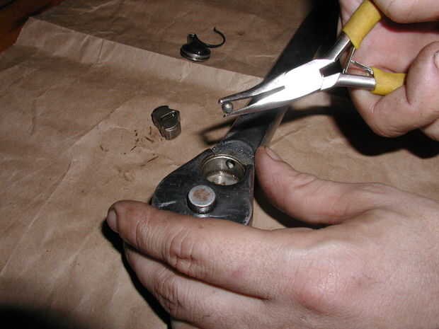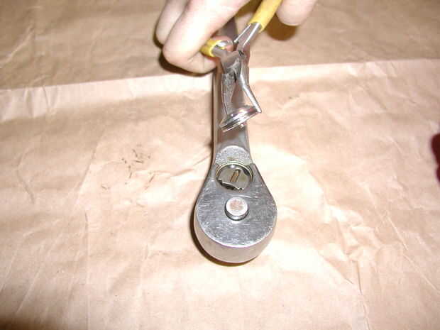 Use un par de alicates de punta para quitar los clips y lentamente separe la parte posterior de la rueda dentada.  Tenga cuidado de no perder la bola. Se encuentra un resorte en el orificio situado en la empuñadura de la carraca.