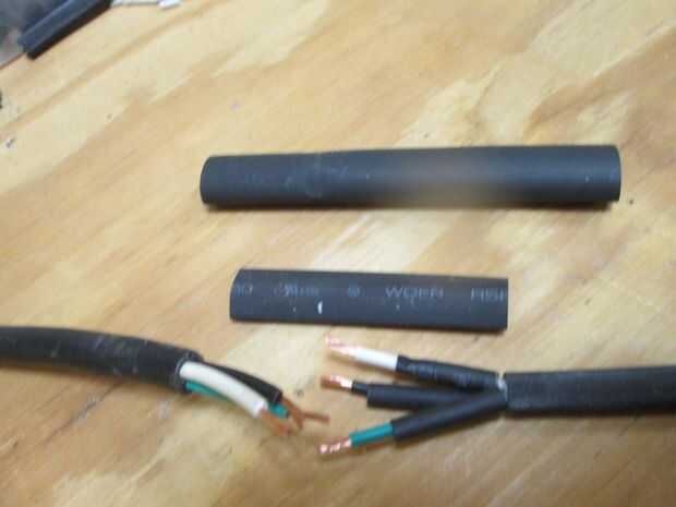 Para mantener el cable fuerte y seguro, las conexiones soldadas y aisladas. Para ello, corte 3 trozos de encogimiento de calor 1 1/4" de largo que se ajuste sobre los conductores internos. Deslice éstas sobre los cables. Corte un pedazo de disipador de calor de 3/8 la misma longitud que el área reparada. Su propósito es añadir un poco de relleno sobre los conductores internos. Usted también necesitará un pedazo de encogimiento del calor de 3/8 de 5 pulgadas de largo. Deslice la pieza de 5 pulgadas sobre uno de los cables y luego deslice la pieza más corta. Es importante tener estos se deslizó en el cable antes de soldar.