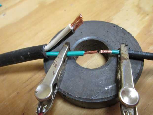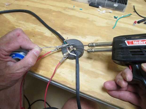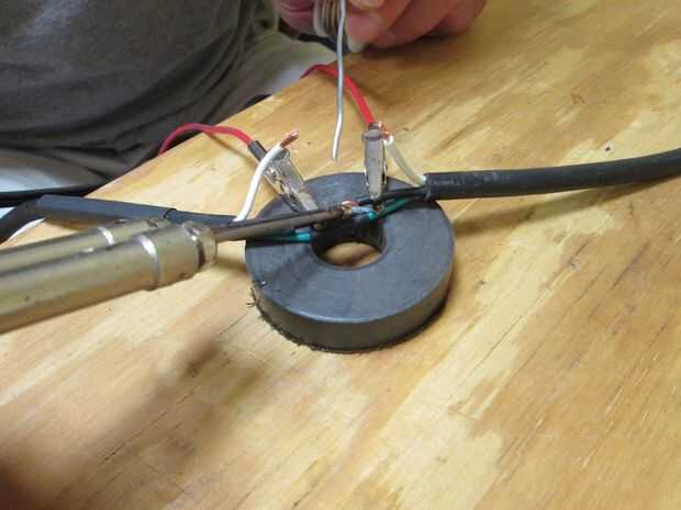 He encontrado una manera práctica para sujetar los cables para soldar es utilizar pinzas de cocodrilo en un puente de alambre. Pegar las pinzas de cocodrilo al imán y mantenga los cables juntos para soldar. Asegúrese de que coinciden con los mismos colores de cables. Negro con negro, blanco con blanco, verde con verde