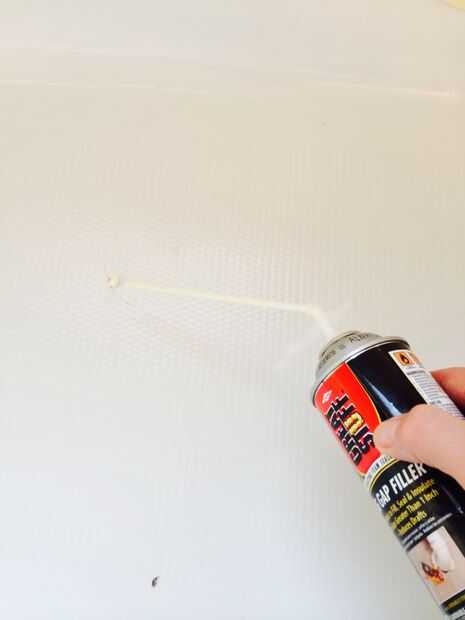 Utilice una espuma de aislamiento. Utilicé grandes cosas para huecos mayores de 1 pulgada. Práctica aplicar la espuma primero en un pedazo de madera de desecho para conseguir una sensación para él. Inserte el tubo de aplicación en el bolsillo de aire y la espuma del aerosol hasta que llena el bolsillo de aire todo. Poco de espuma se expandirá fuera del agujero. Limpie esta espuma en exceso, cada 2 a 3 minutos hasta que se detenga la expansión.