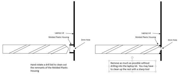 Perforé 2 agujeros de pequeños de 3mm a través de la tapa del ordenador portátil situado en el centro de los portafiltros de plástico que los insertos roscados. Necesitaba estos agujeros para insertar los tornillos a través de la tapa que finalmente se fije la bisagra. Usé una broca más grande (alrededor de 1/4 de pulgada) y trenzado con mis dedos para eliminar suavemente los restos de la carcasa plástico roto. No perfore la tapa del portátil. Deberá utilizar un destornillador pequeño para socavar cualquier bits restantes de plástico.