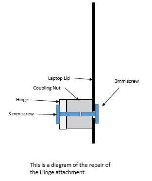 Vuelva a colocar las bisagras. Los tornillos y la tuerca de acoplamiento que utilicé fueron de 3mm. Esto era ligeramente más grande que los tornillos originales así que tuve que taladrar los agujeros de las bisagras de un poco más grandes. El dibujo muestra el montaje final de la reparación. Después de colocan las bisagras, sustituir la guarnición y la reparación se ha completado.