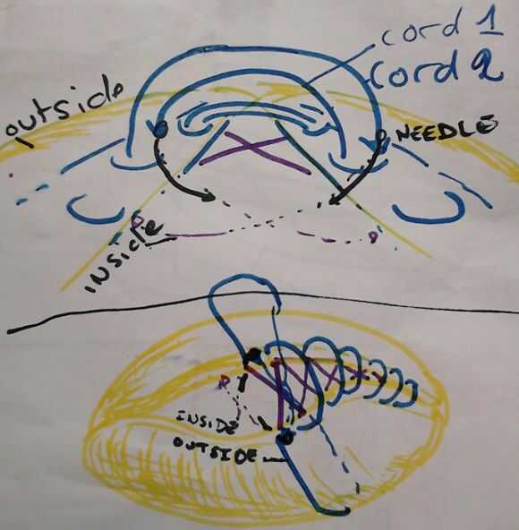 A)-pasar las agujas dentro de los mismos orificios de gemelos otra vez pero en vez de hacer un bucle completo allí pasar las agujas en los agujeros consecutivos próximos cruzando las cuerdas desde el interior. Apriete localmente la bola y tirar fuertemente de los cordones para hacer la tela apretada en ese momento sin romper las cuerdas.