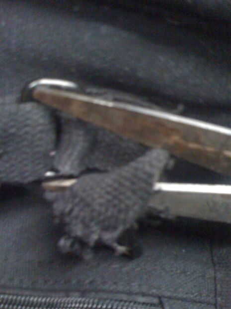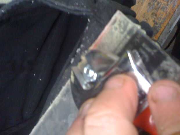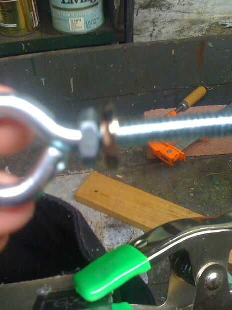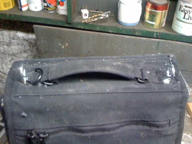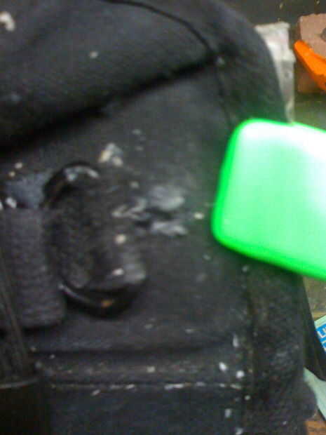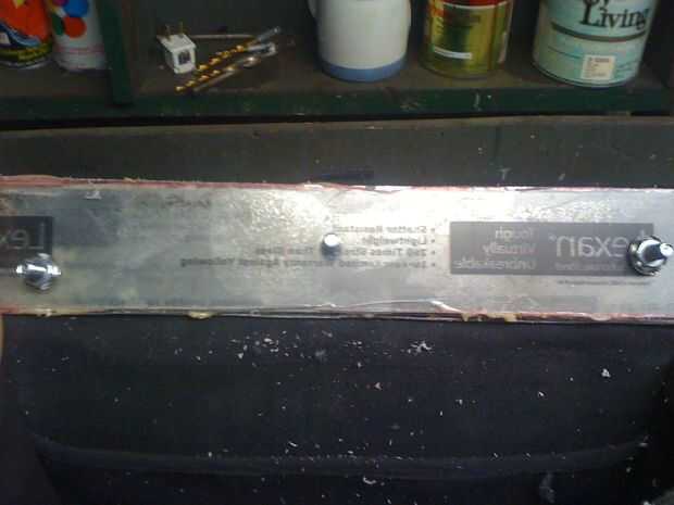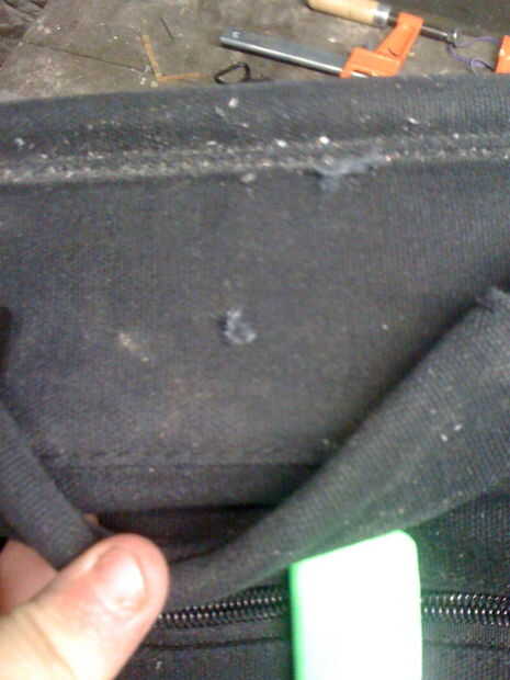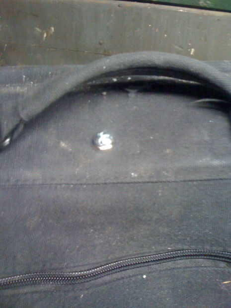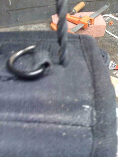 Con la barra hecho y pegado es momento de agregar la conexión real y los puntos de anclaje para la correa. Hasta es eliminar todas las abrazaderas y la madera de desecho. A continuación retire cualquier correa deshilachada. Salí de aquel que estaba intacta porque todavía estuve probando para ver si funciona mi corrección, lo que hace. Próxima tirada encima de la broca y a conectarlo. Usted puede perforar desde el lado de paño o de lexan, no importa. Elige tu lado y desde un extremo alrededor de una pulgada en, o cerca de las aletas originales como sea posible. Perforar lentamente, no quieres derretir el plástico. A través de una vez ponen una arandela y una tuerca en su anilla aprieta la tuerca lo más lejos posible y atornillar el tornillo a través del agujero nuevo, con el ojo siendo perpendicular al mango. En el lado opuesto del perno después de él es a través del otro lado poner en una arandela y una tuerca. Apriete manualmente la tuerca hacia abajo tanto como sea posible. Toma tu destornillador e insertar a través del ojo, aprovecha contra las paredes por lo que se puede mantener apretado. Uso a continuación, una llave para apretar la tuerca hasta que esté lo suficientemente firme que no tiene cualquiera da cuando la argolla se tiró en. Repita en el otro lado. Taladro debajo del asa para el perno normal. Poner una arandela en el tornillo e inserte a través del orificio nuevo. Coloque una arandela y una tuerca en el otro lado. Meter el destornillador en la parte superior del perno, teniendo cuidado de mantener el mango fuera del camino. Mano apriete la tuerca y apriete con la llave plana. Felicidades. La bolsa está ahora lista para su uso.