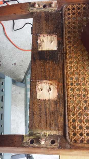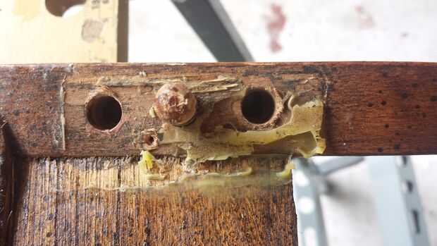 Como se puede ver en las fotos, esta silla ha sido reparada una vez antes (al menos). El pegamento viejo que se ha secado en gruesos trozos por las articulaciones nos dice que esta no es la manera que vino de la fábrica. Esta silla en particular tiene dos puntales o listones debajo del asiento para ayudar a mantener el asiento de la silla a la silla de nuevo. En este caso, los tornillos han sido retirados completamente de la parte posterior de la silla.
