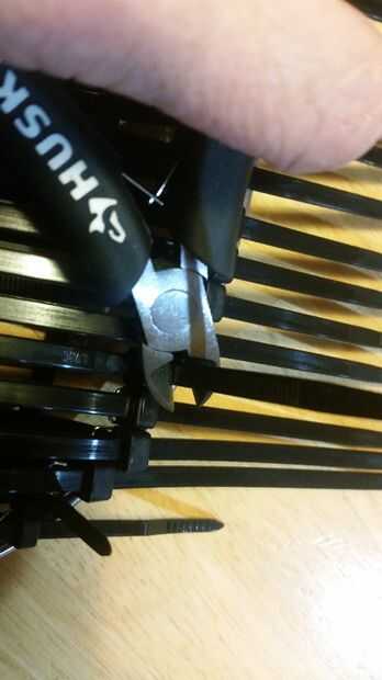 El siguiente paso es cortar todas las colas de amarre zip. Usé unas tenazas pequeñas. Esto funcionó bien pero duele un poco la mano y cuando tenga 50 o más colas para cortar. Tuve que tomar un descanso en un momento para descansar las manos.