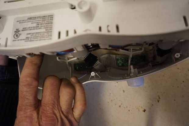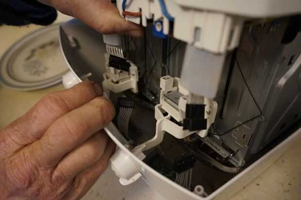 En este caso hubo conectores de dos cables de cinta que controles electrónico de botón en la parte superior de la carcasa del chasis. Los conectores tuvieron que ser desconectado antes de que pudiera levantar el chasis de la caja.