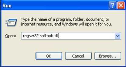 2. en el cuadro Abrir, escriba regsvr32 softpub.dll y luego haga clic en Aceptar.