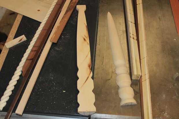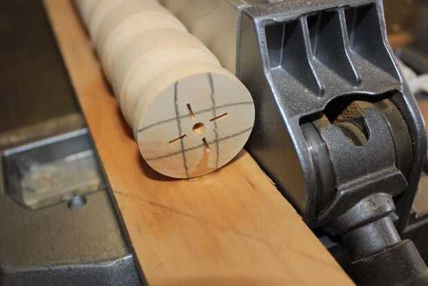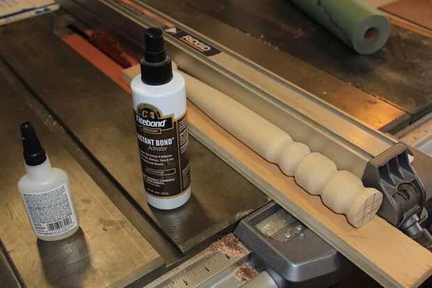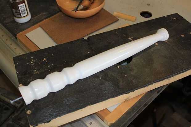 Necesitaba aplanar un lado de la columna así que poner una gota de pegamento en el centro de un pedazo de madera contrachapada y puso la columna en el punto de pegamento. Poner una gota en el borde. Esto le permitirá establecer simplemente la madera contra la guía y la mesa para cortar un segmento recta fuera del centro. por último, la columna fue pintada pintado y pegado en lugar de la pared interior.