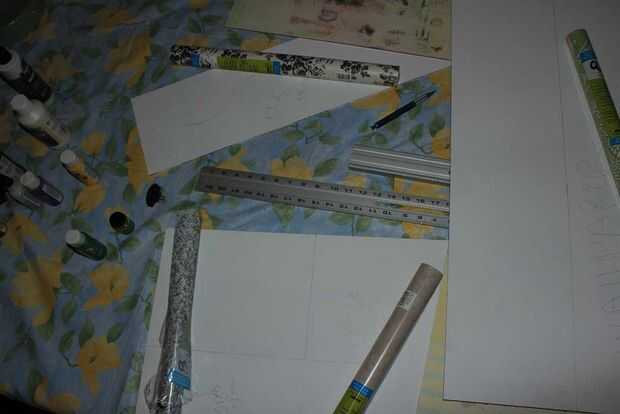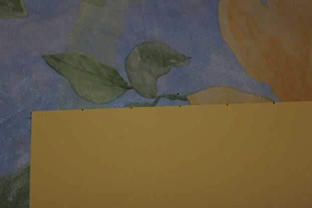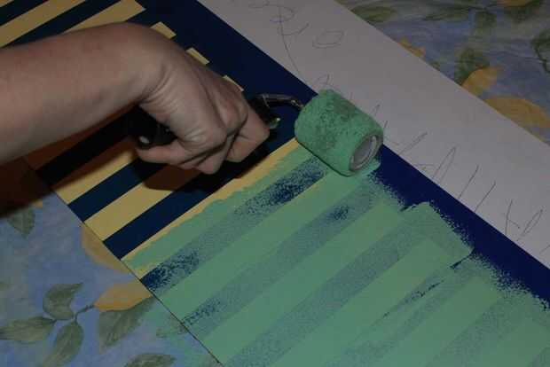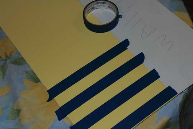 Añadimos rayas a una de las paredes. Primero hemos pintado una agradable capa de amarillo. Después del secado, utilizando un lápiz, hizo una marca cada pulgada de la parte superior y la línea de fondo. Luego, utilizando 1" cinta de pintor, graba cada otra línea.