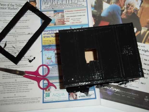 Ahora que el cuadro está seco, es hora de arena otra vez. Asegurándose de que no hay bordes ásperos ni adhesivo que se pega hacia fuera, luego polvo y pintarlo. He usado real Exterior plano negro (látex acrílico). Tomó cerca de 3 capas para un acabado sólido.