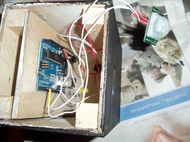 Luego deslice dentro de la caja y poner un tornillo grande (1/2") en la parte superior de ella en uno de los soportes rectanglar (pieza E) enfrente del lado del sensor PIR.
